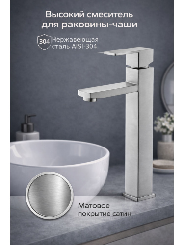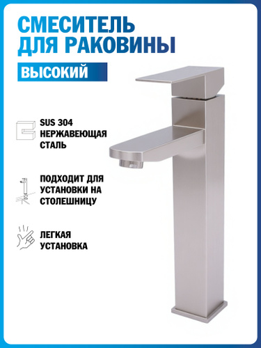 Смеситель для раковины высокий, квадратный, сатин, нержавеющая сталь