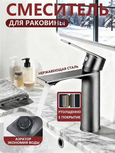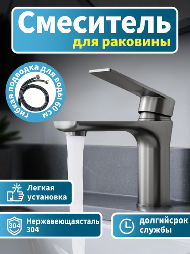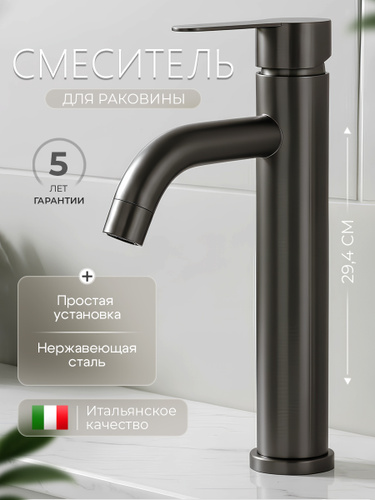 Смеситель для накладной раковины высокий с литым изливом из нержавеющей стали цвет графит