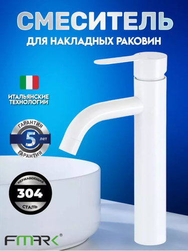 Смеситель для накладной раковины высокий с литым изливом из нержавеющей стали цвет белый