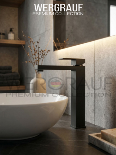 Смеситель на столешницу , смеситель для раковины чаши, высокий Wergrauf. Квадратный, чёрный матовый