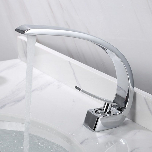 Смеситель для раковины (умывальника) дизайнерский, полукруглый, в ванную комнату, серебристый, металл