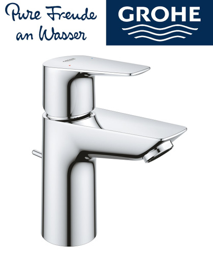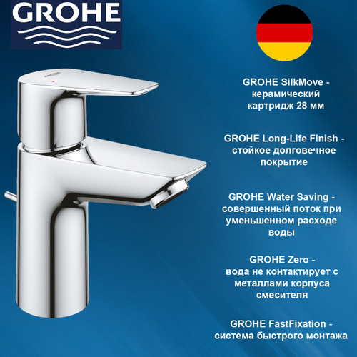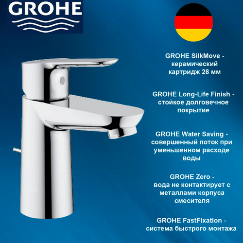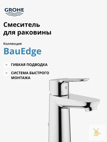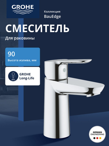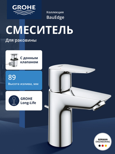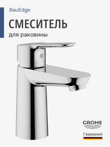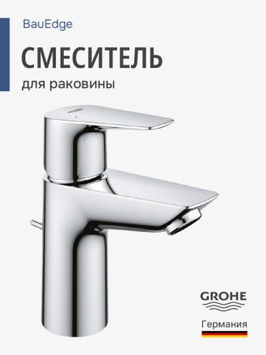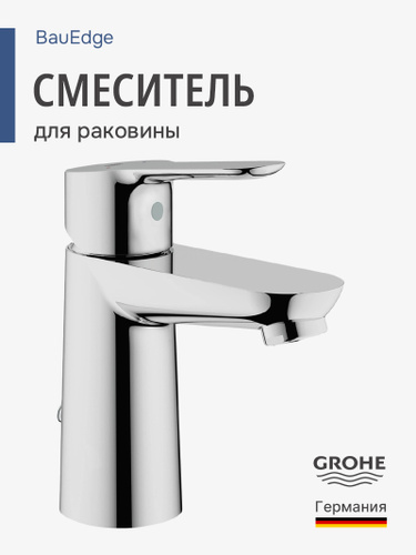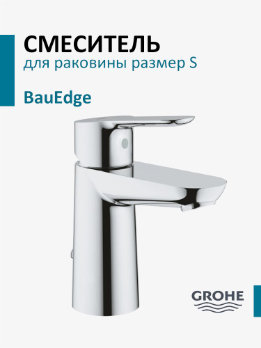Смеситель для раковины GROHE BauEdge с ограничителем температуры и рычажным донным клапаном, S-Size, хром