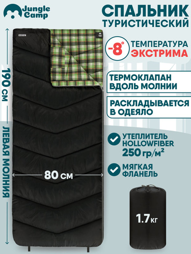 Спальник туристический/Спальный мешок Jungle Camp Essen, с фланелью, левая молния, цвет: черный