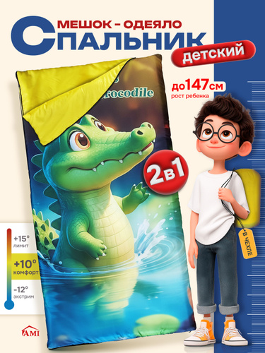 AMI MEBEL Спальный мешок туристический детский для сна малыша Crocodile 147 см, спальник одеяло для туризма похода и рыбалки, подарок для девочки и мальчика на новый год и рождество, застежка молния