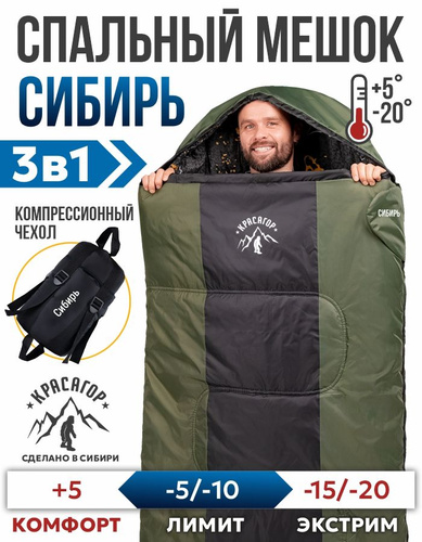 Спальный мешок туристический Красагор Сибирь до -20 (черно-зеленый)