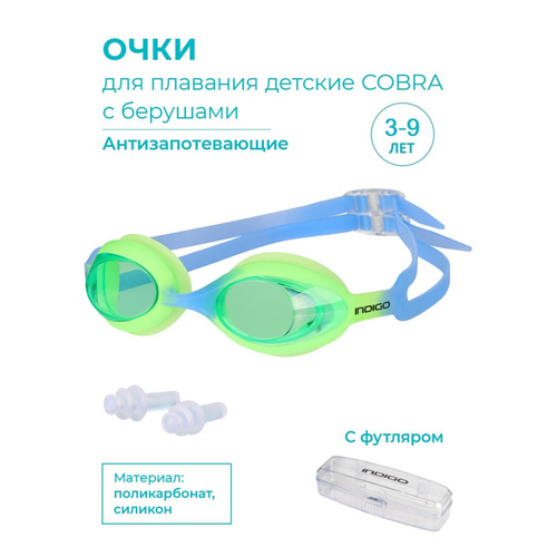 Очки для плавания детские для мальчика и девочки INDIGO COBRA, зелено-синий