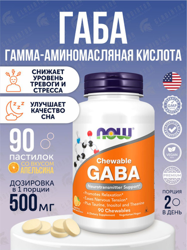 ГАМК, ГАБА Now Foods GABA, 250 мг, 90 жевательных таблеток Апельсин