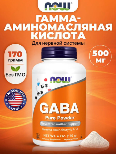 NOW GABA 500mg, Гамма-аминомасляная кислота (ГАМК), порошок 170г, Аминокислота, для мозга, успокоительное для взрослых, антистресс