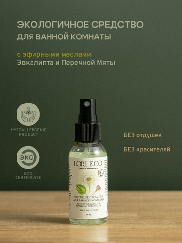 LORI ECO Чистящее средство для ванной с эфирным маслом Эвкалипт и Перечная Мята, без отдушек, без красителей, экологичное, 50 мл.