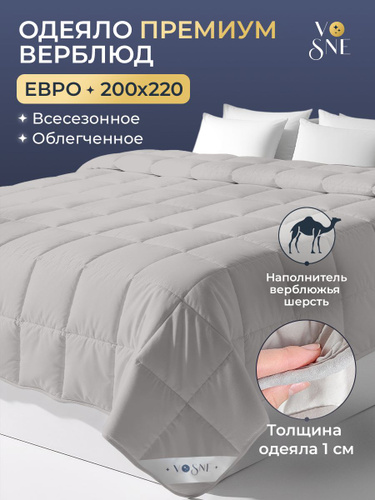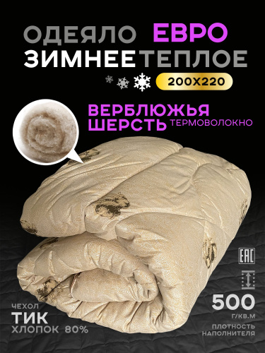 Одеяло Евро 200x220 см, Зимнее, с наполнителем Верблюжья шерсть, Объемное полиэфирное волокно