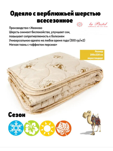 Pastel Одеяло Евро 200x220 см, Всесезонное, Зимнее, с наполнителем Верблюжья шерсть, Силиконизированное волокно, комплект из 1 шт