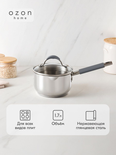 Кухонный ковш с крышкой 1,7 литра из нержавеющей стали со стеклянной крышкой, глянцевый.