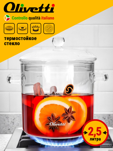 Кастрюля 2,5 литра из термостойкого высококачественного боросиликатного стекла Olivetti CSG03 с крышкой, коллекция Vetro, можно мыть в посудомоечной машине