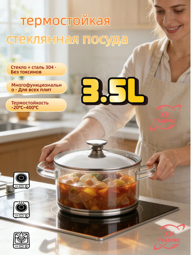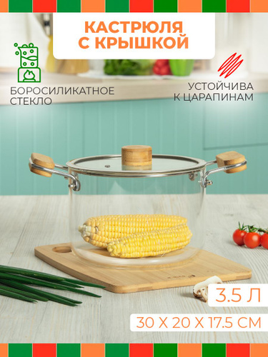 Кастрюля стеклянная жаропрочная с крышкой, 3500 мл, Прозрачная