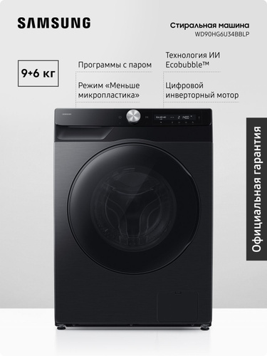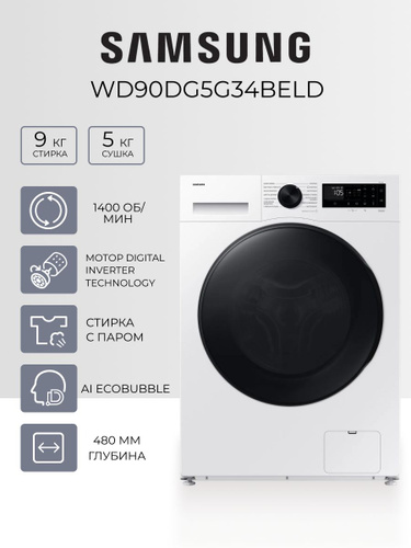 Стиральная машина с сушкой Samsung WD90DG5G34BВLP 9 + 5 кг с паром, инверторный мотор, технологии Ecobubble и Bubble Shot, приложение SmartThings, черный