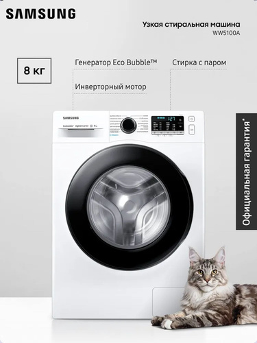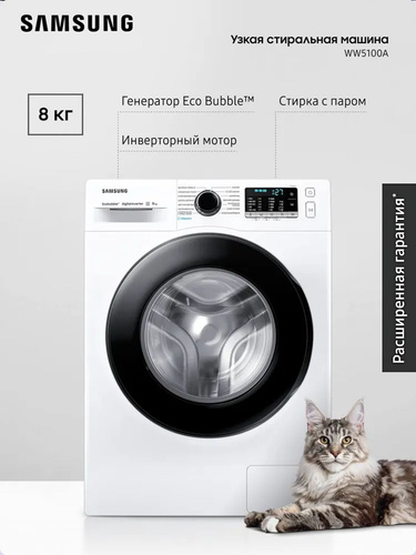 Стиральная машина Samsung WW80AGAS21AELP, узкая, загрузка до 8 кг, с инверторным мотором и дезинфекцией