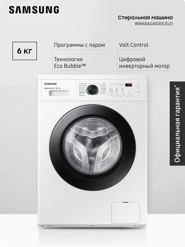 Стиральная машина Samsung WW60AG4S00CELD 6 кг с паром, инверторный мотор, технология Ecobubble, система Volt Control, очистка барабана Drum Clean