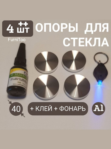 Опора алюминиевая для стеклянной столешницы (4 штуки) в комплекте с УФ клеем и фонариком. Готовый (крепёж) набор для крепления стекла.( Пятак, фланец, шайба, монтаж без сверления)