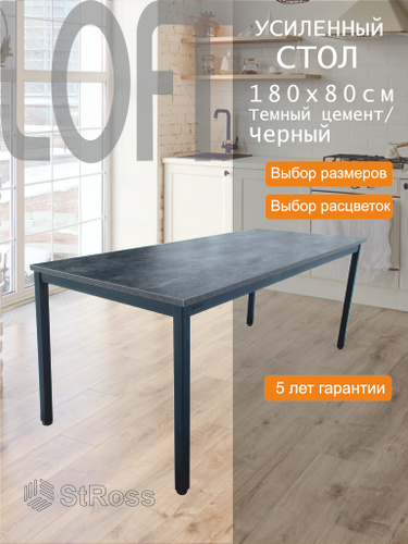 StRoss Стол кухонный обеденный Лофт 180 х 80 см, темный цемент / черный