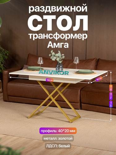 Стол трансформер раздвижной обеденный журнальный полубарный лофт Амга золотой/белый