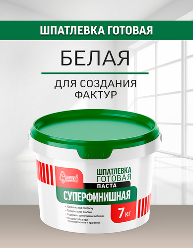 Шпатлевка готовая для стен, полимерная, суперфинишная, для потолков, для заделки швов, белая, 7кг