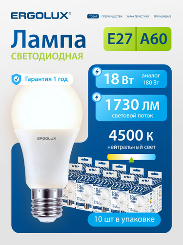 Лампочка светодиодная E27 18 Вт Ergolux, дневной белый свет, 1 шт