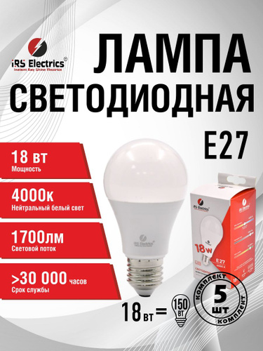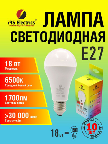 Лампочка светодиодная E27, iRS Electrics, 18 Вт (150Вт), холодный белый свет 6500К, упаковка 10 шт