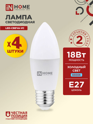 Лампочка светодиодная Е27 свеча 18W холодный свет 6500К 1620Лм упаковка 4шт. IN HOME