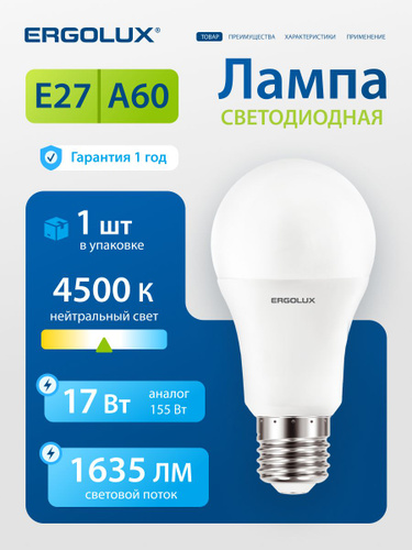 Лампочка светодиодная E27 17 Вт Ergolux, дневной белый свет, 1 шт