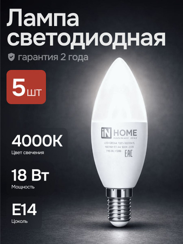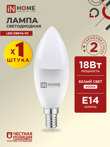 Лампочка светодиодная Е14 свеча 18W нейтральный свет 4000К 1620Лм упаковка 4шт. IN HOME