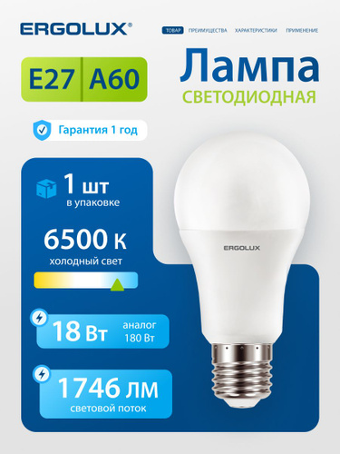 Лампочка светодиодная E27 18 Вт Ergolux, холодный белый свет, 1 шт