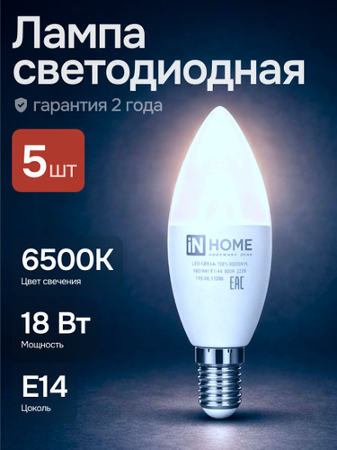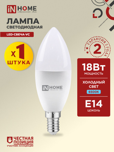 Лампочка светодиодная Е14 свеча 18W холодный свет 6500К 1620Лм упаковка 4шт. IN HOME
