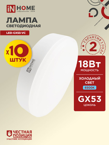 Лампочка светодиодная GX53 18W холодный свет 6500K 1710Лм упаковка 10 шт. IN HOME