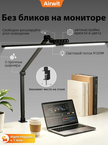 Бестеневая настольная лампа Airwit с автоподстройкой яркости и цвета 910 лм, 3 шарнира, надёжное крепление