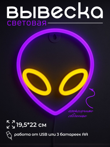 Неоновый светильник Инопланетянин, 19,5*22 см. Сиреневый/Желтый, 1 шт / Неоновая вывеска на стену