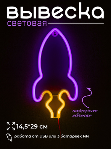 Неоновый светильник Ракета, 14,5*29 см. Сиреневый/Желтый
