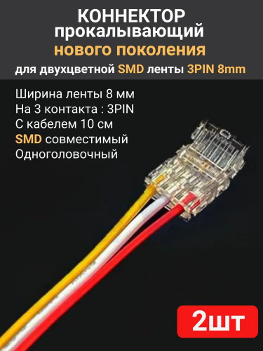 Коннектор для светодиодной ленты 8мм 3pin с кабелем 10см, 2 шт, соединитель для светодиодной ленты SMD двухцветной 8mm одноголовочный прокалывающий трехконтактный.