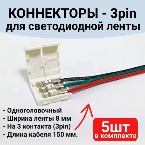 Коннектор для светодиодной ленты 8мм 3pin, 5 шт. с проводом 150мм, соединитель для светодиодной ленты двухцветной 8mm одноголовочный трехконтактный.