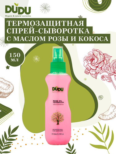 DUDU Термозащитная спрей-сыворотка с маслом розы и кокоса, для поврежденных, секущихся, пористых волос, несмываемый уход, 150мл