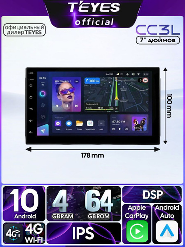 Магнитола Teyes CC3L 4/64GB Универсальная 7 дюймов, штатная магнитола, 8-ми ядерный процессор, IPS экран, DSP, 4G, Wi-Fi, 2 DIN