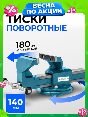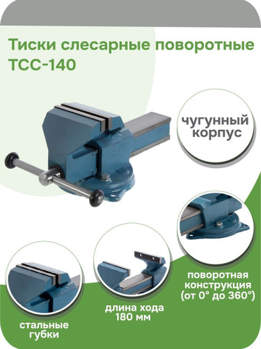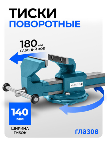 Тиски слесарные поворотные ГЛАЗОВ, 140 мм ширина рабочих губок, настольные, корпус из чугуна ВЧ50, губки из стали 50Х, рельефные прижимные губки, Россия, 18667