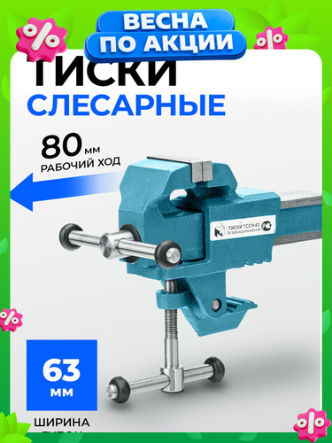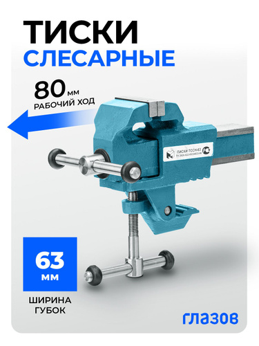 Тиски слесарные поворотные ГЛАЗОВ, 63 мм ширина рабочих губок, настольные с винтовым механизмом, корпус из чугуна ВЧ50, губки из стали 50Х, рельефные прижимные губки, Россия, 18660