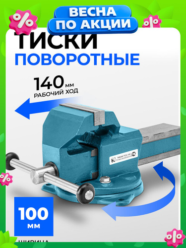 Тиски слесарные поворотные ГЛАЗОВ, 100 мм ширина рабочих губок, настольные, корпус из чугуна ВЧ50, губки из стали 50Х, рельефные прижимные губки, Россия, 18663