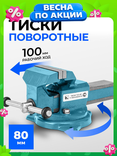 Тиски слесарные поворотные ГЛАЗОВ, 80 мм ширина рабочих губок, настольные, корпус из чугуна ВЧ50, губки из стали 50Х, рельефные прижимные губки, Россия, 18662