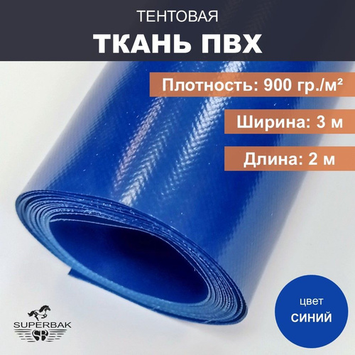 Ткань тентовая ПВХ на отрез ширина 3 м, длина 2м, плотность 900 гр/м, синяя