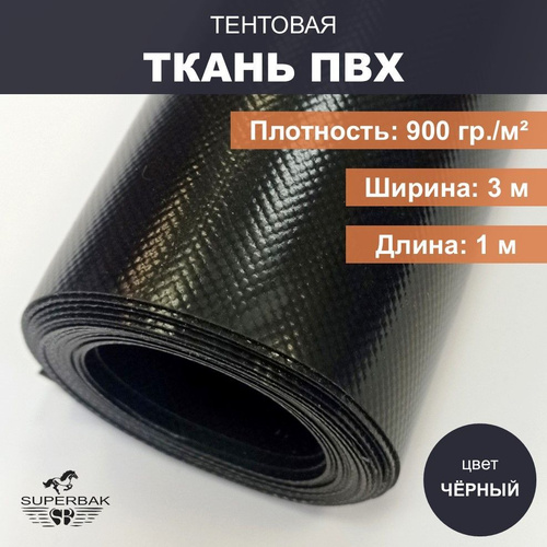 Ткань тентовая ПВХ на отрез ширина 3 м, длина 1м, плотность 900 гр/м, чёрная