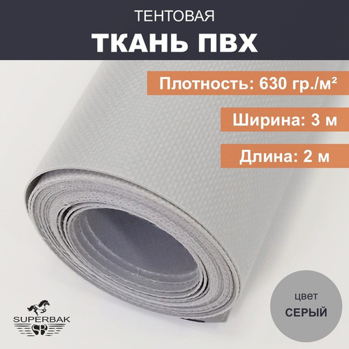 Ткань тентовая ПВХ на отрез ширина 3 м, длина 2м, плотность 630 гр/м, серая