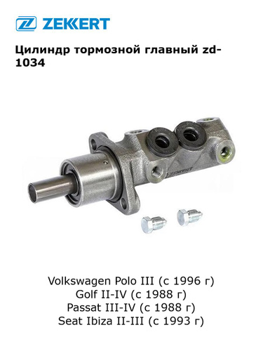 Цилиндр тормозной главный для Volkswagen Polo III (с 1996 г), Golf II-IV (с 1988 г), Passat III-IV (с 1988 г), Seat Ibiza II-III (с 1993 г) арт zd-1034