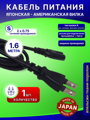 Кабель питания Японская вилка / Американская вилка Jet H03VVH2-F сечение 2 х 0,75 мм2 ISM 7A/125V длина 1,6 м