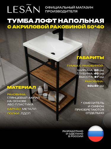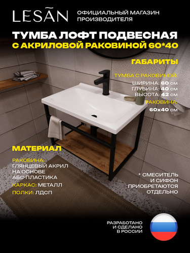 Тумба лофт напольная дуб вотан с лёгкой акриловой раковиной 60*40 для ванной комнаты LESAN